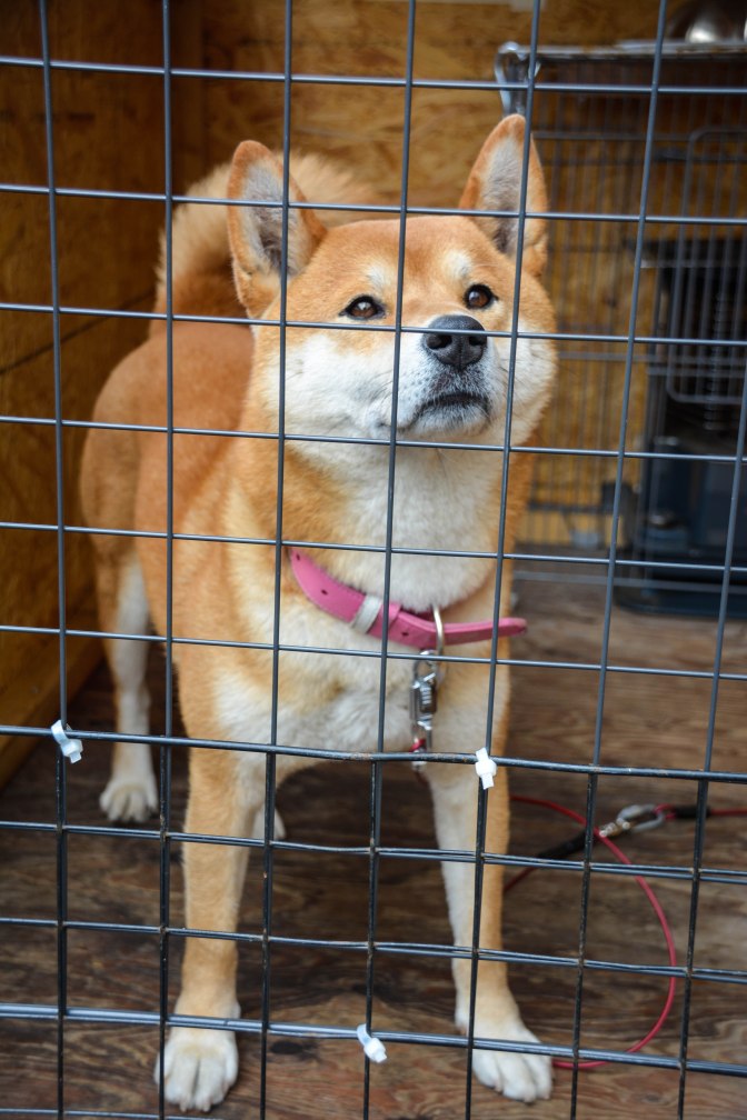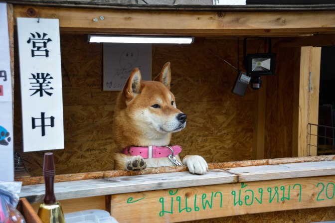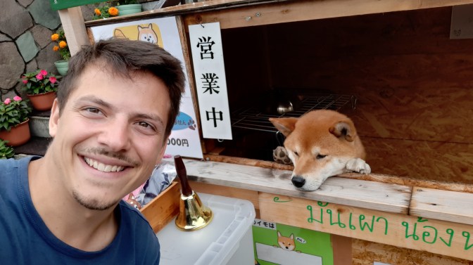Ken was actually a normal Japanese dog until his owners came up with the idea of opening a shop he could run. In the left box, corncobs and sweet potatoes are offered alternately and paid for in the small red slit on the left side of the stand. As soon as visitors arrive and Ken is not too tired, he looks up curiously and is happy to be stroked. Of course we couldn’t deny him this.