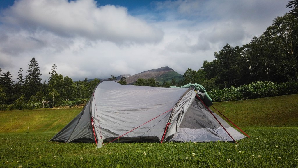 Shortly before packing up our tent Tokachi-Dake showed it’s friendly face and shows it’s peak.