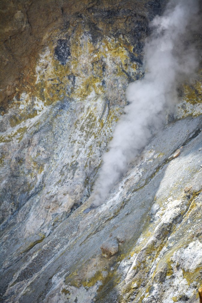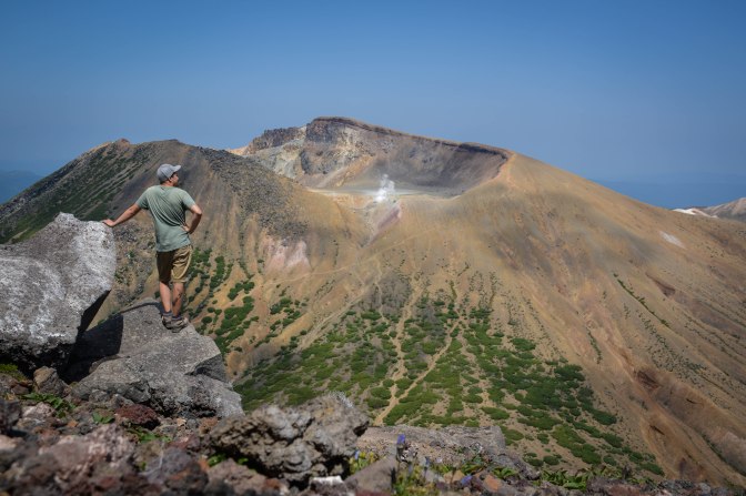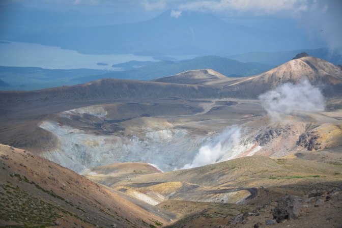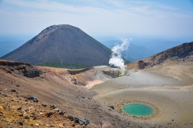 The path wounded further up and after the tree line the crater of Meakan–Dake followed. Our first real volcano in Japan! The activity also became obvious quickly, because in many places deafening sulfur fumaroles came to the surface. Arriving at the highest point of the crater rim, we could not only enjoy our usual food, consisting of toasted toast and sliced cheese, but also a magnificent panorama: