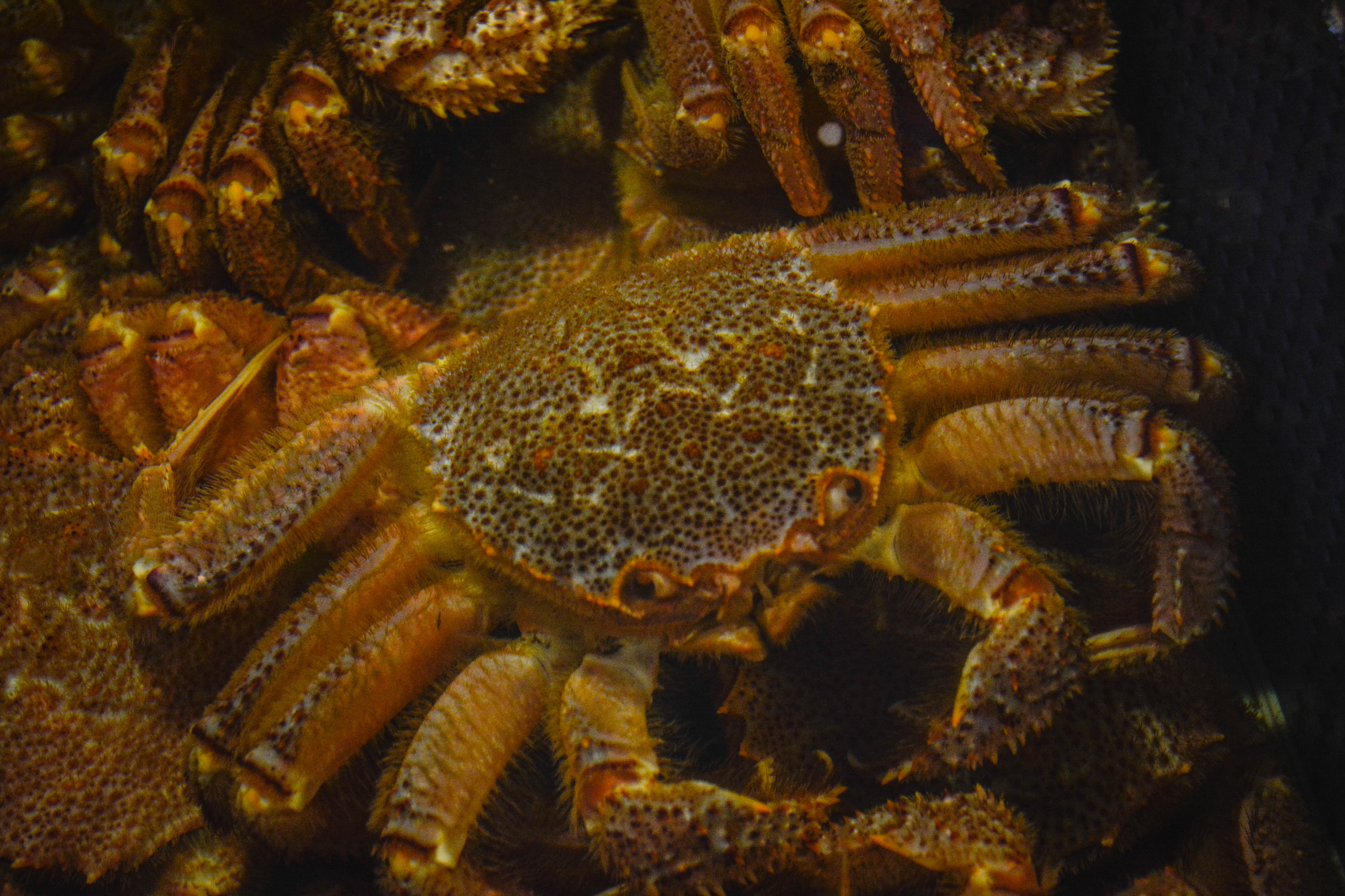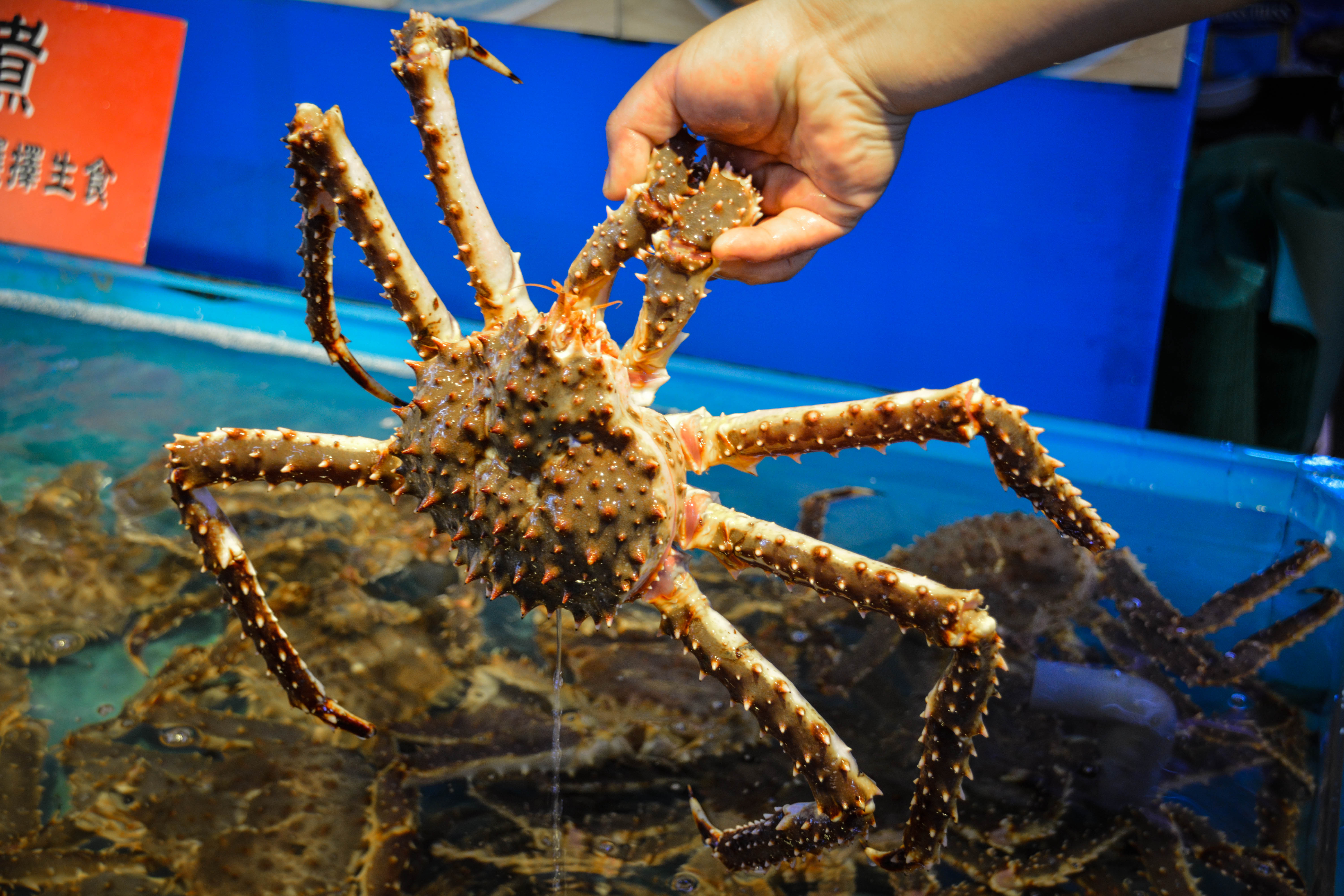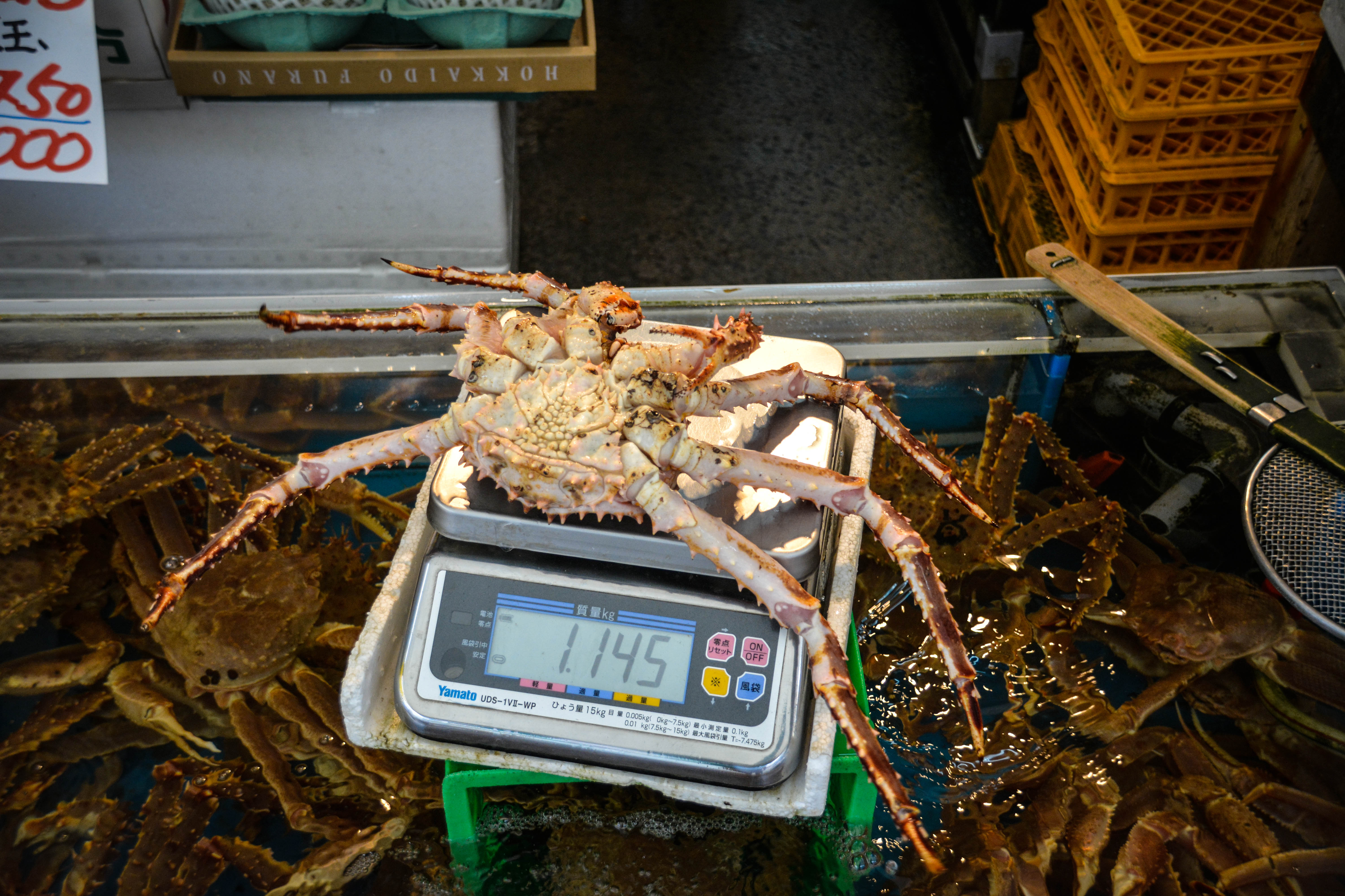 At a stand we asked how much a king crab weighs, whereupon the seller simply reached into the aquarium and put one on the scales.