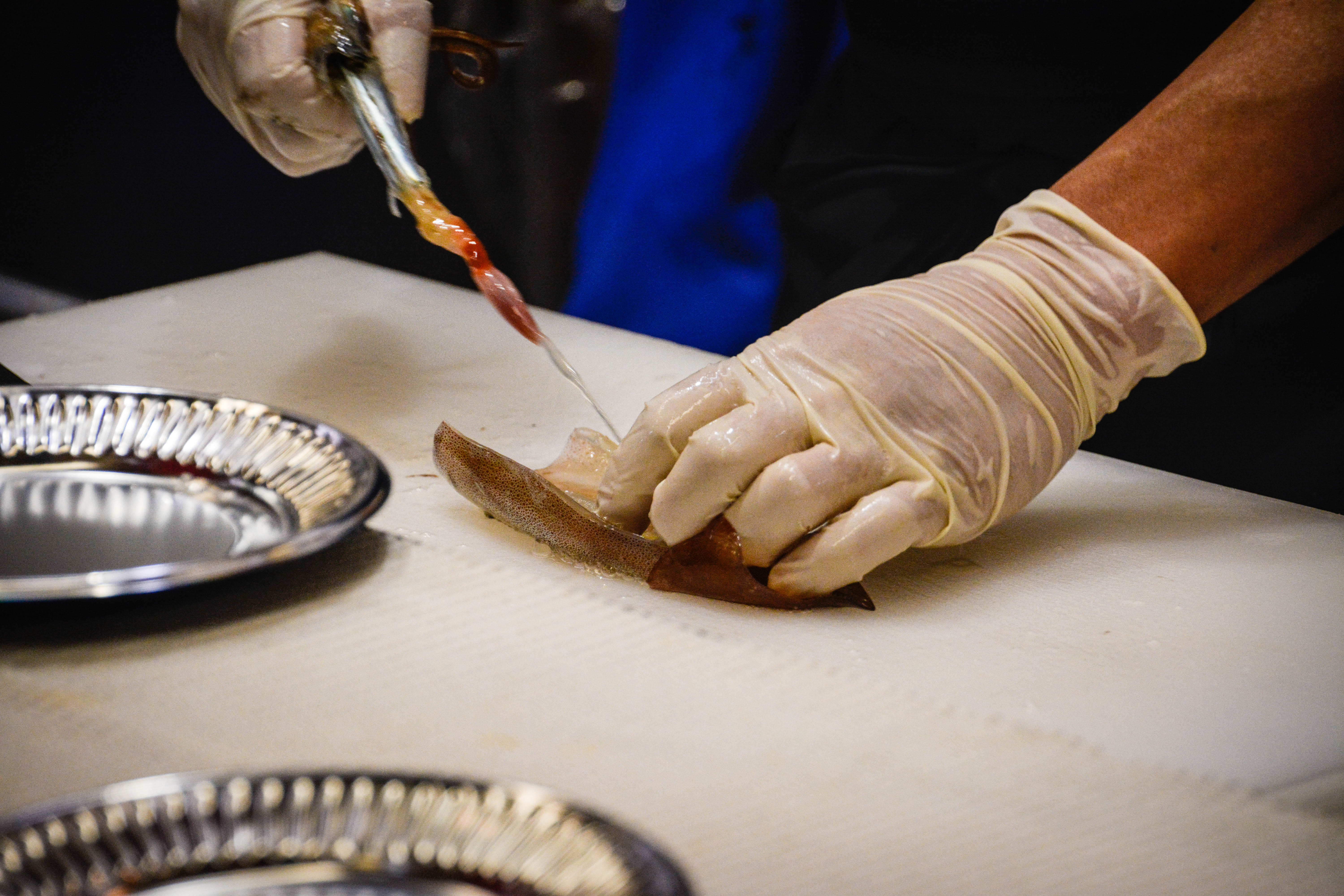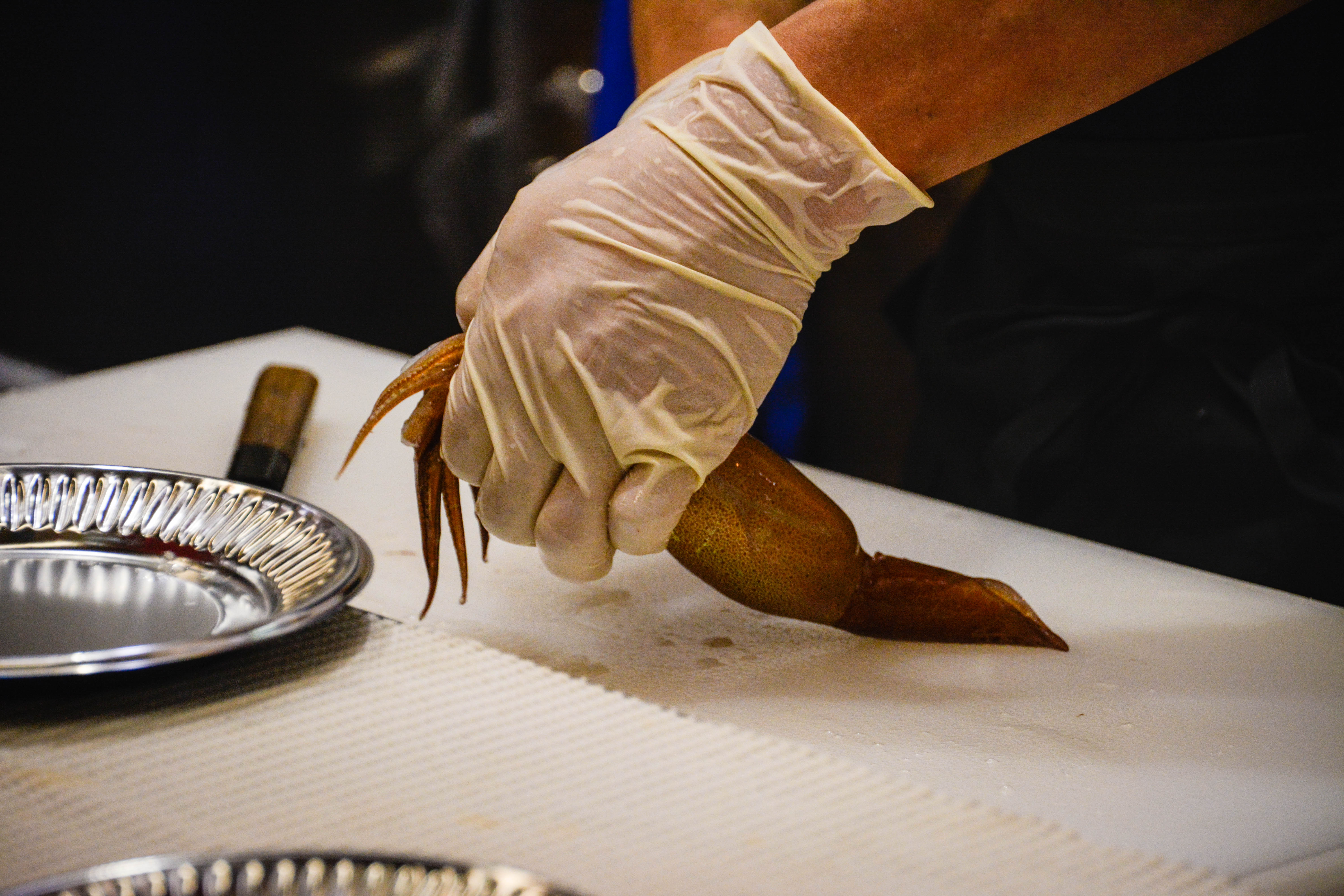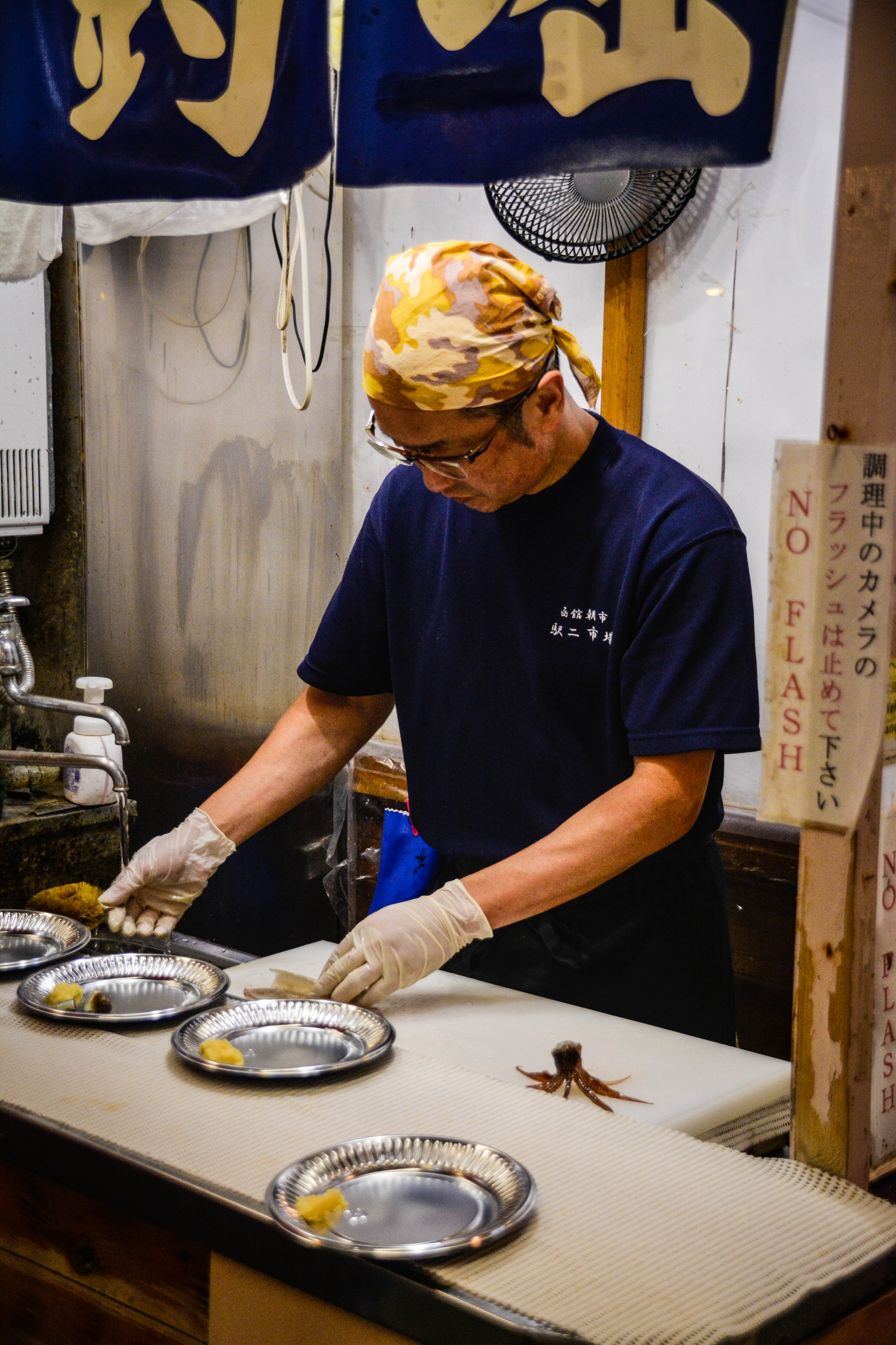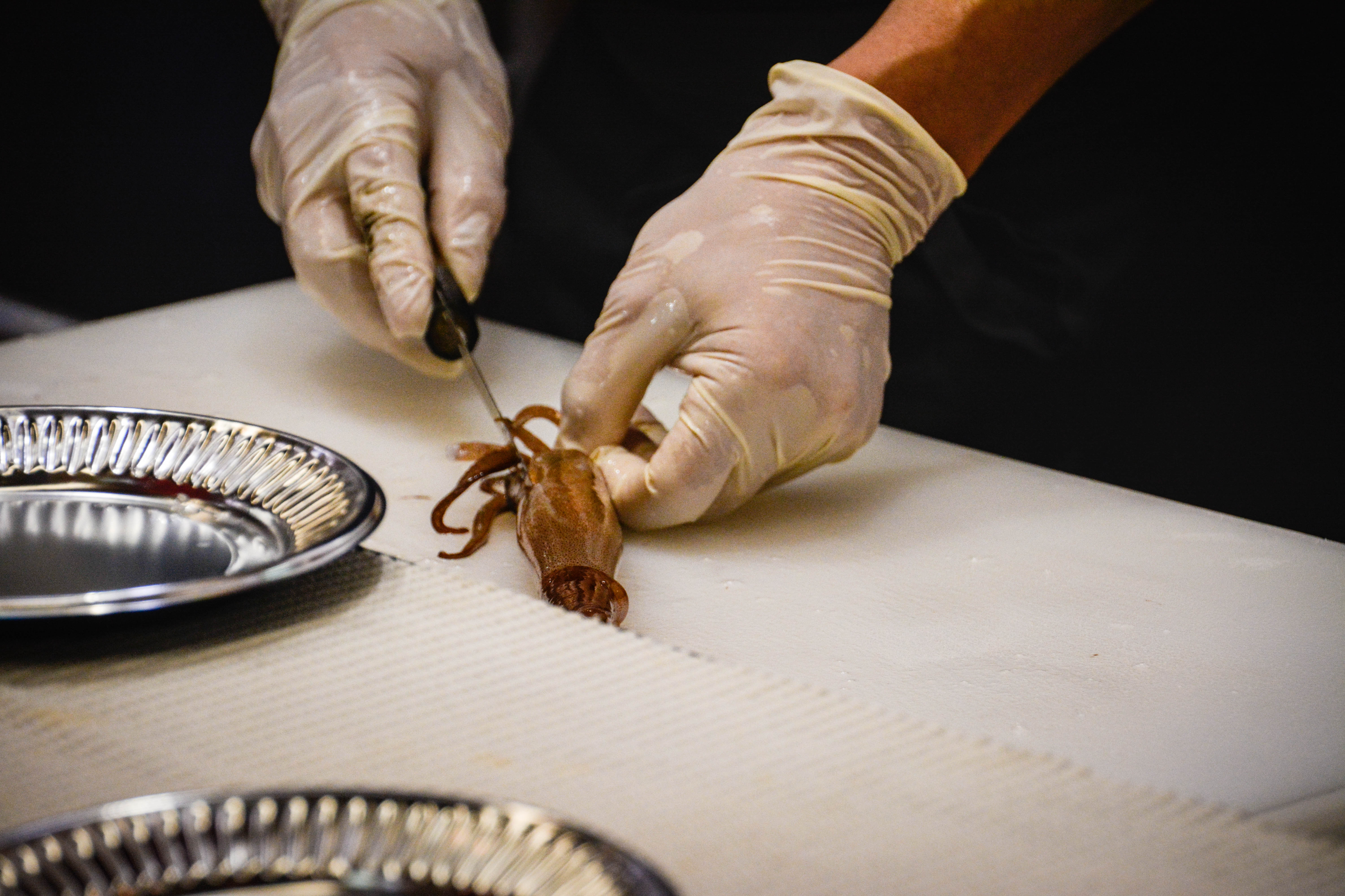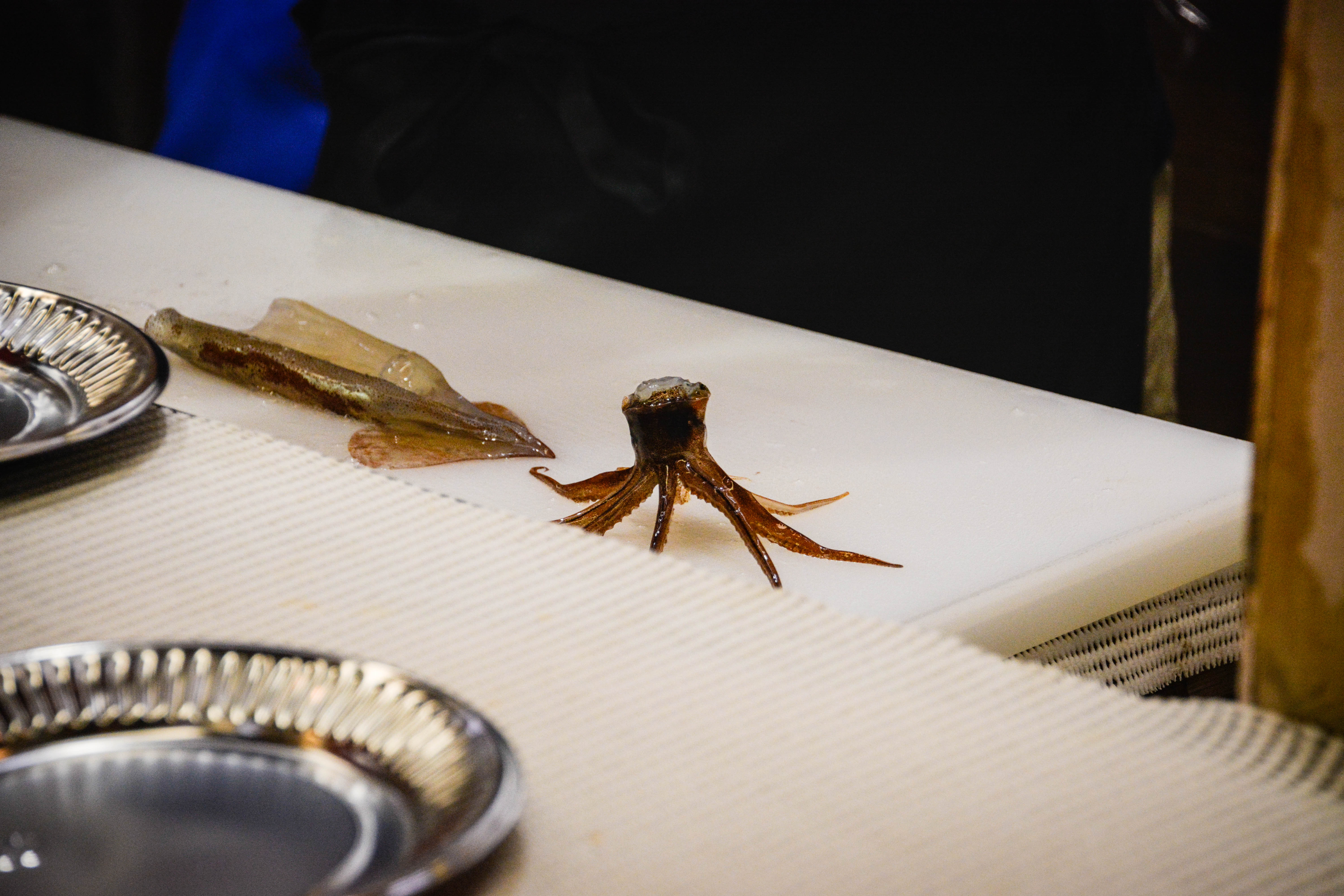 As we stroll across the market, the craftsmanship of the fishermen is evident to us. One of them cut up squids in a few seconds from alive to ready to serve: