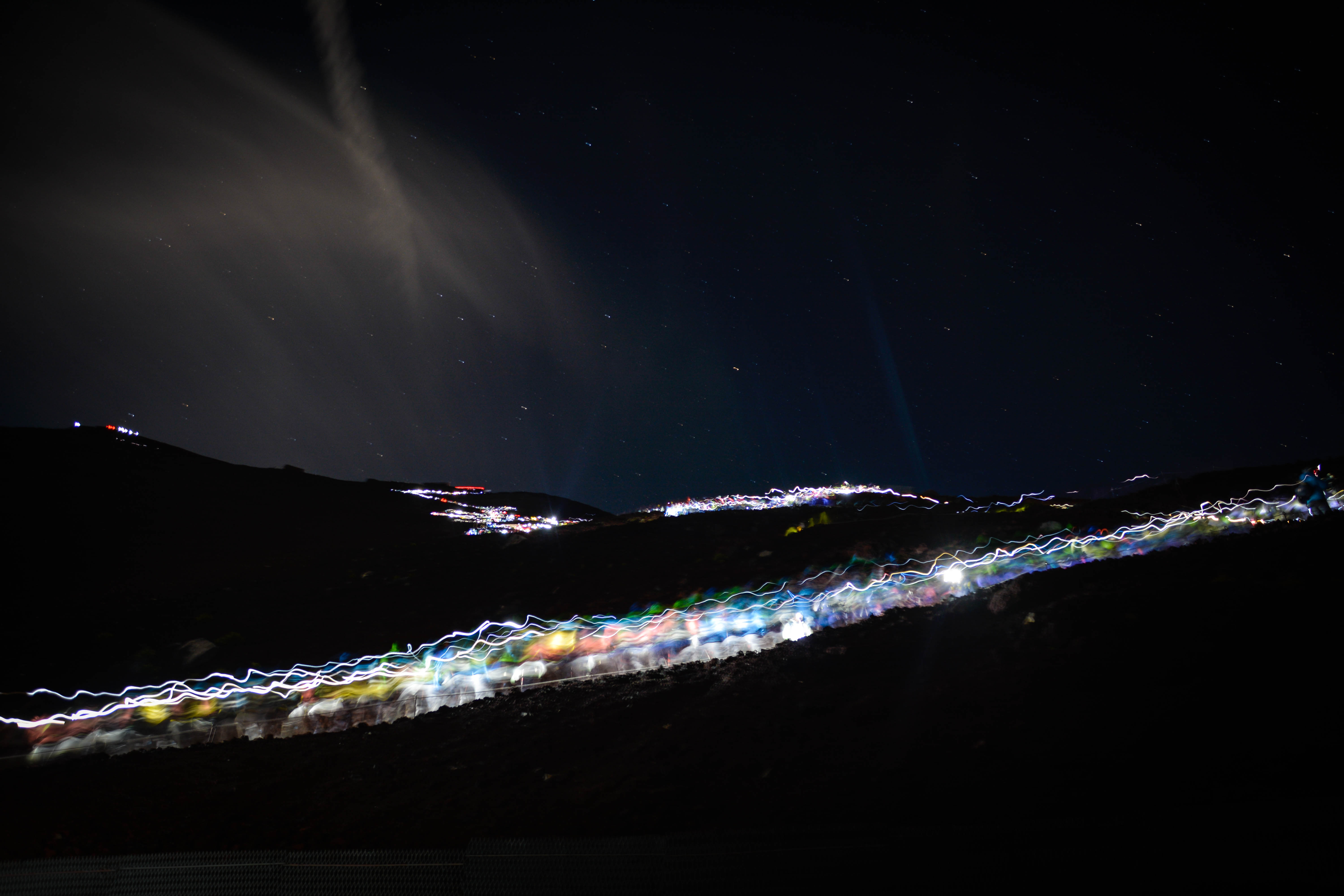 Of course you can climb the Fujisan during the day. You can also climb it during the day with overnight stays in huts (of which there are really plenty). But these cost 50 to 80 €. We simply did not want to pay that. So we decided to go the traditional way. At 8 pm we found ourselves (in the pouring rain) at the fifth station – the starting point of the hike. There we met another small German group of hikers who, like us, wanted to do the ascent with headlamps overnight. At a leisurely pace we were supposed to make it to the summit or the crater rim in time for sunrise. So we started leisurely. After we voluntarily had to pay 1.000 Yen for the Fuji Conservation Fund, the path continued upwards in serpentines. At a quarter to 9 we had left, so we had a lot of time to reach the top, because the sunrise is typically in summer at about 5 o’clock. With our headlamps we walked up the mountain and quickly gained altitude. A total of 1,400 vertical meters had to be climbed to the top. After about an hour in the rain we heard astonished calls of many Japanese – the cloud cover had loosened and suddenly you could see a beautiful night sky!
