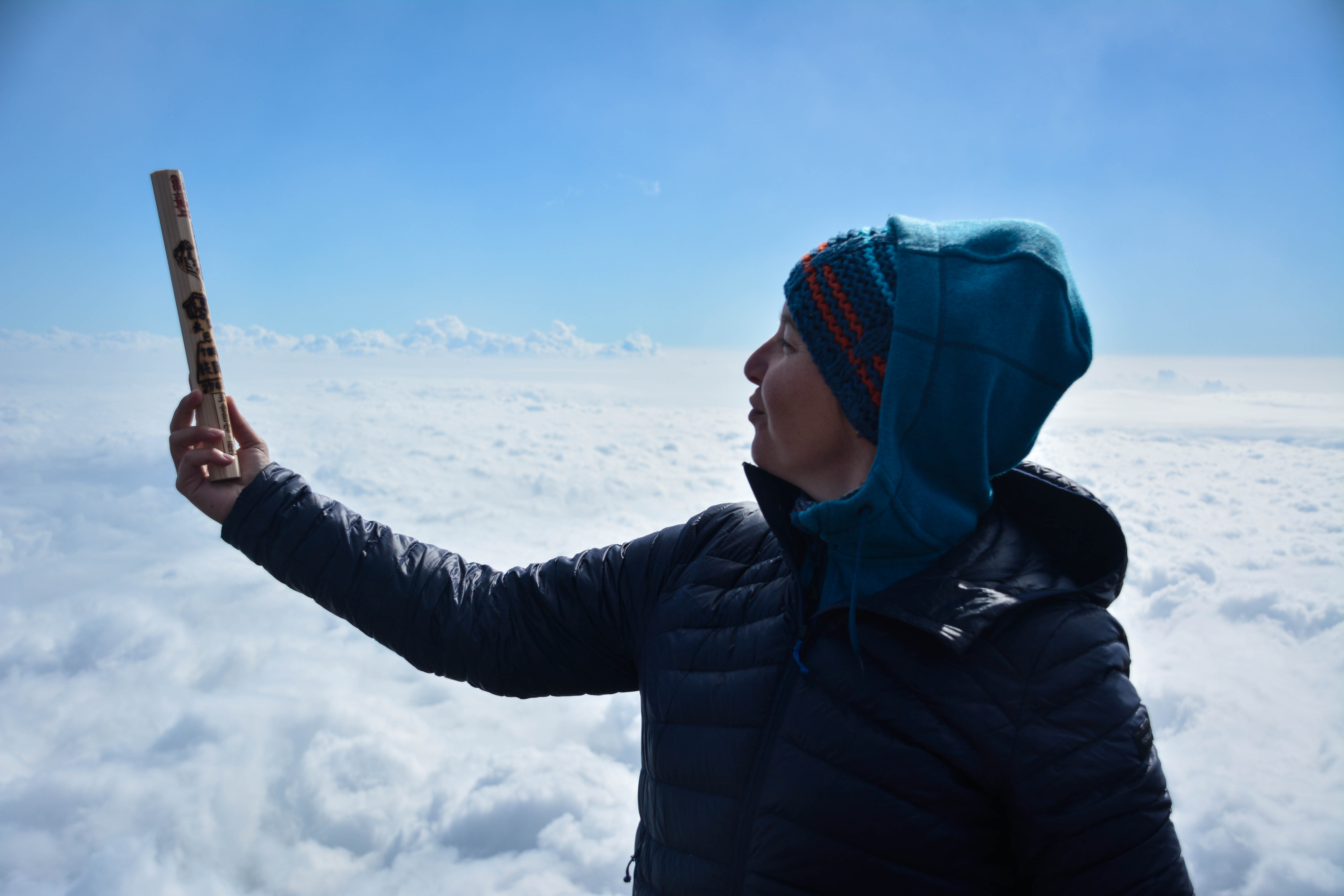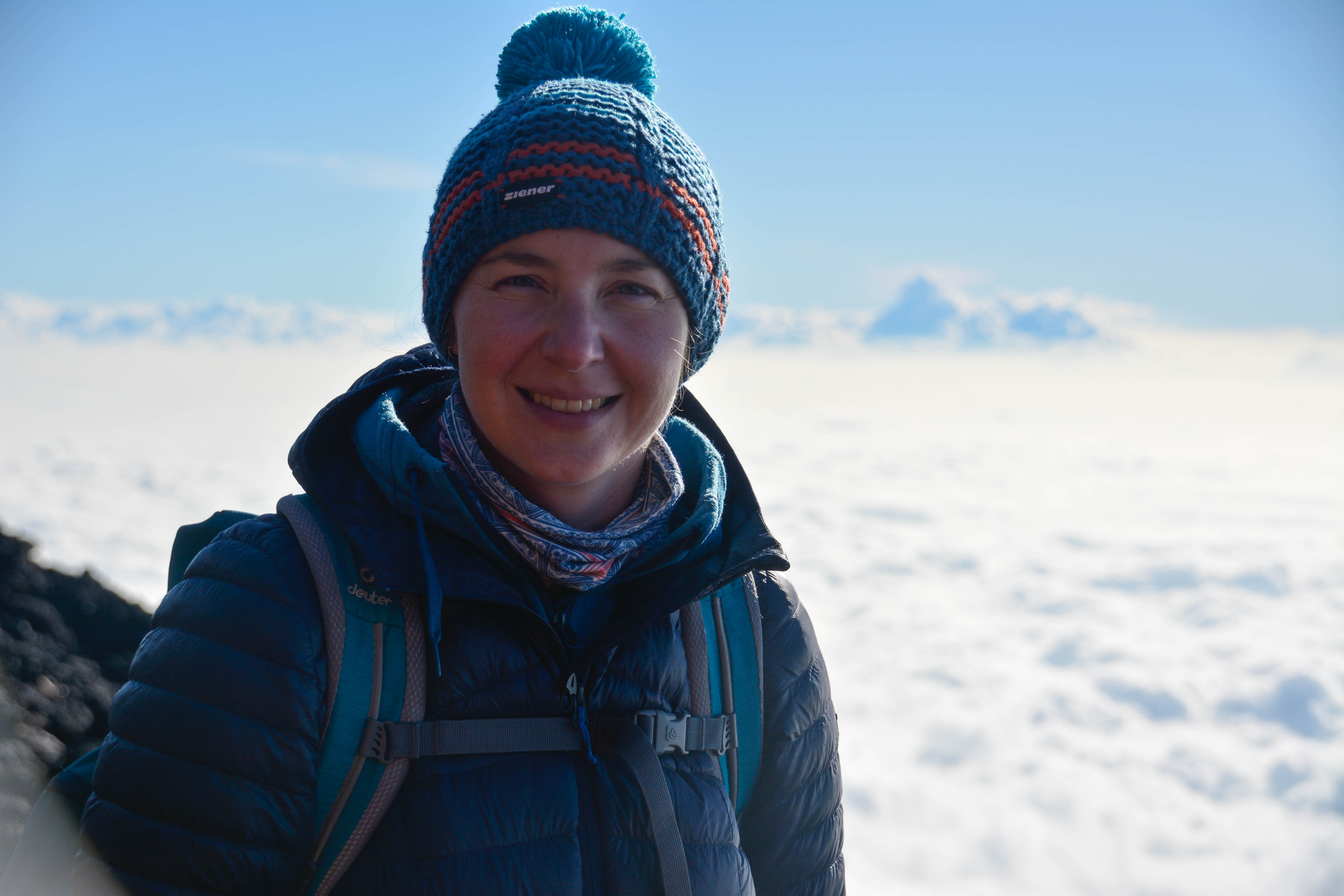 We hope for some more wind and continue to hike to the peak, passing three craters without even seeing them. When we arrived at the peak we are rewarded with strong wind and more mist.