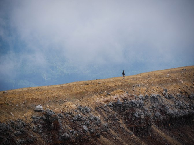Of course, we do not let ourselves be taken by the experience of climbing two volcanoes in one day. But after a 20 minute ascent the clouds have won and we can’t enjoy the other view of Meakan-Dake anymore. Therefore we start the way back and arrive well exhausted at our tent.