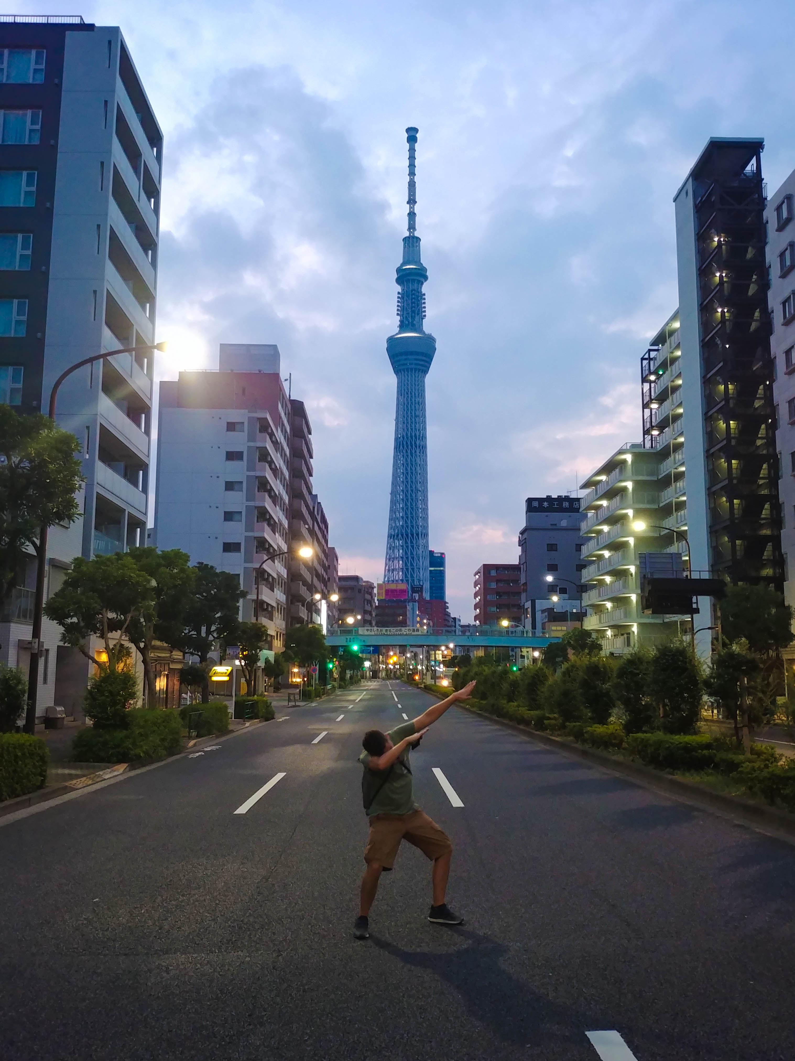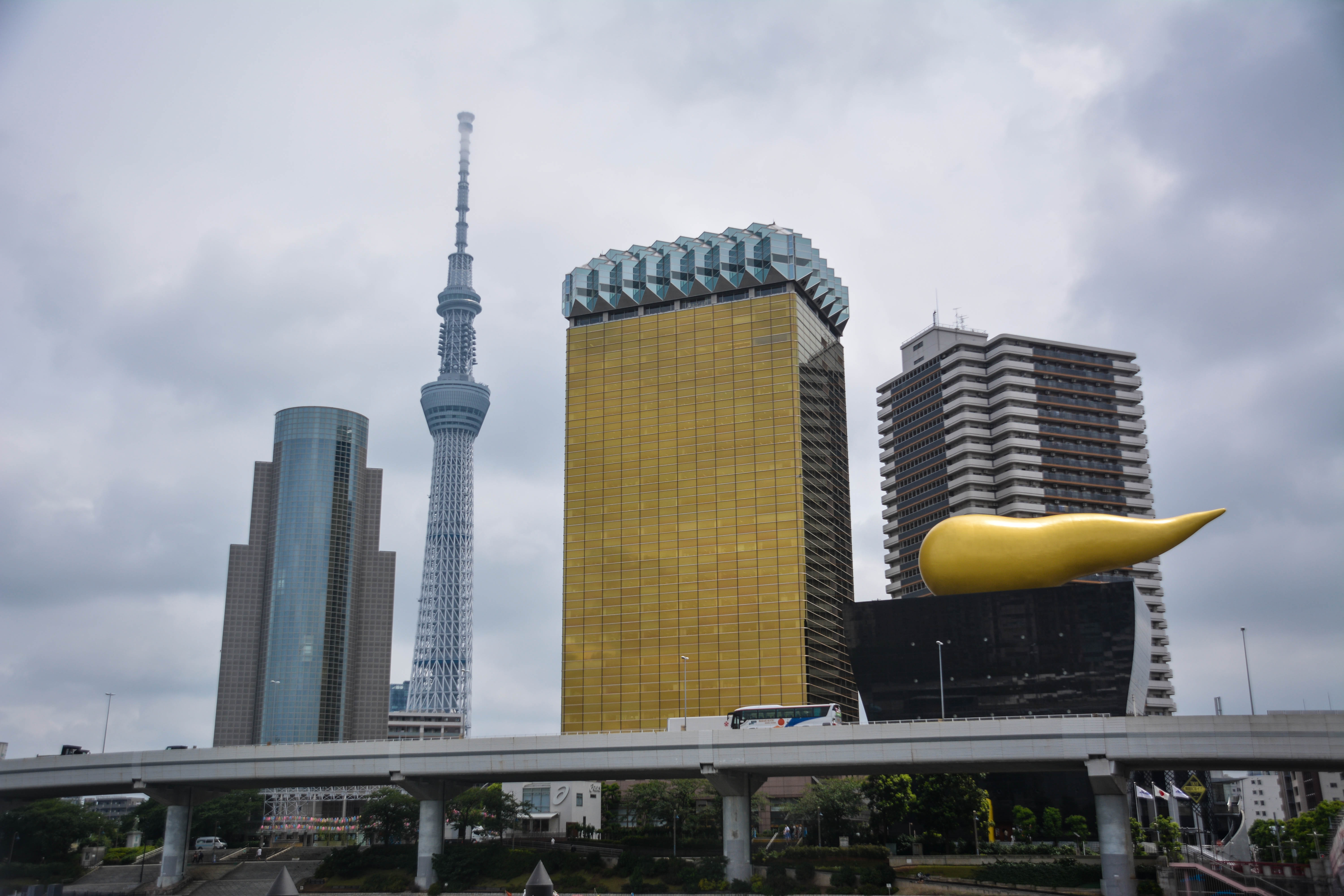 Tokyo is huge! Our trip from Fujikawaguchiko to the Japanese capital takes two hours and you feel like you’re driving 1.5 hours through the city. By metro we continue to our accommodation, which is located in a quiet area behind the main building of the Asahi Brewery. Especially one characteristic of the building catches the eye: What is called Beer Flame reminds rather of a golden carrot.