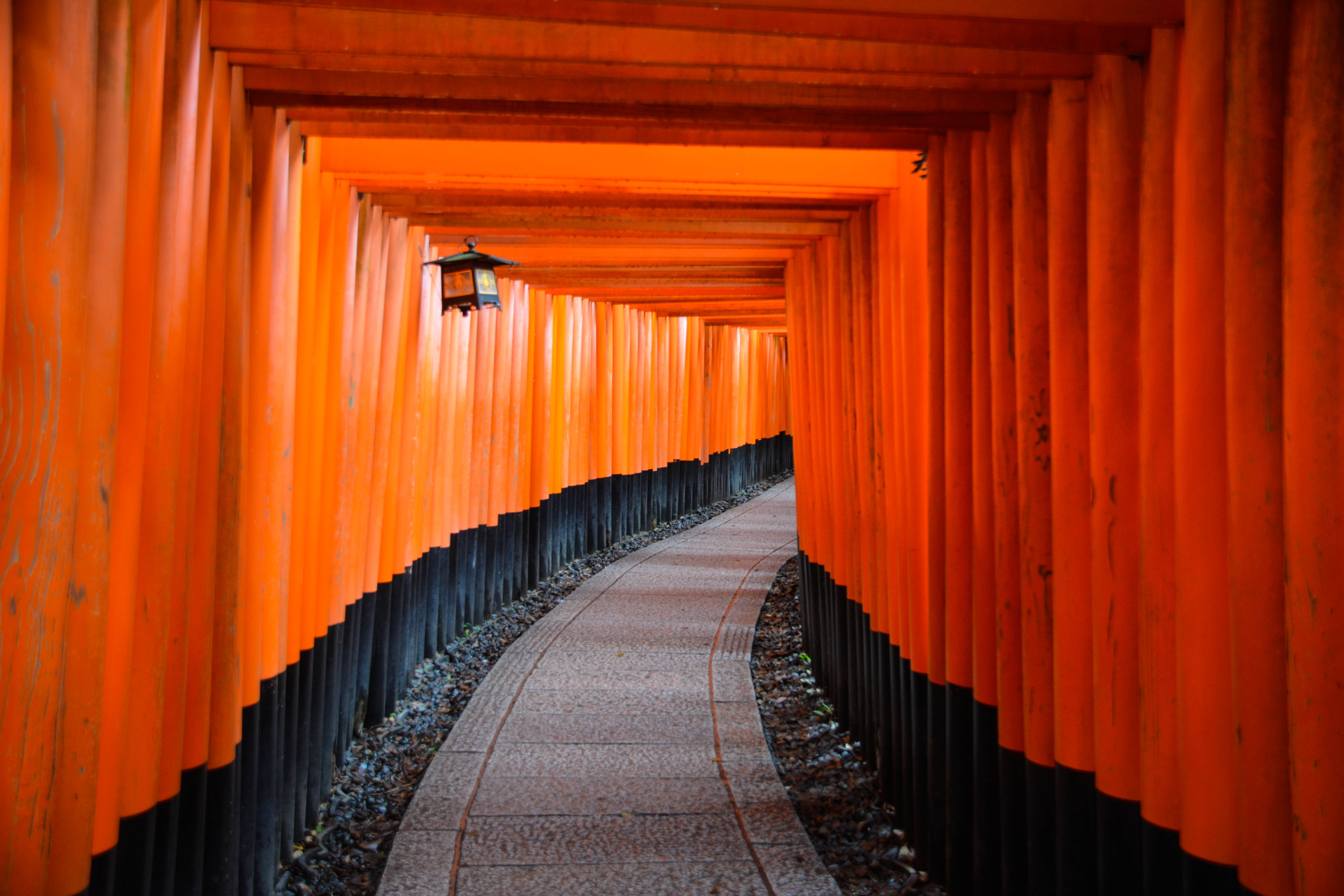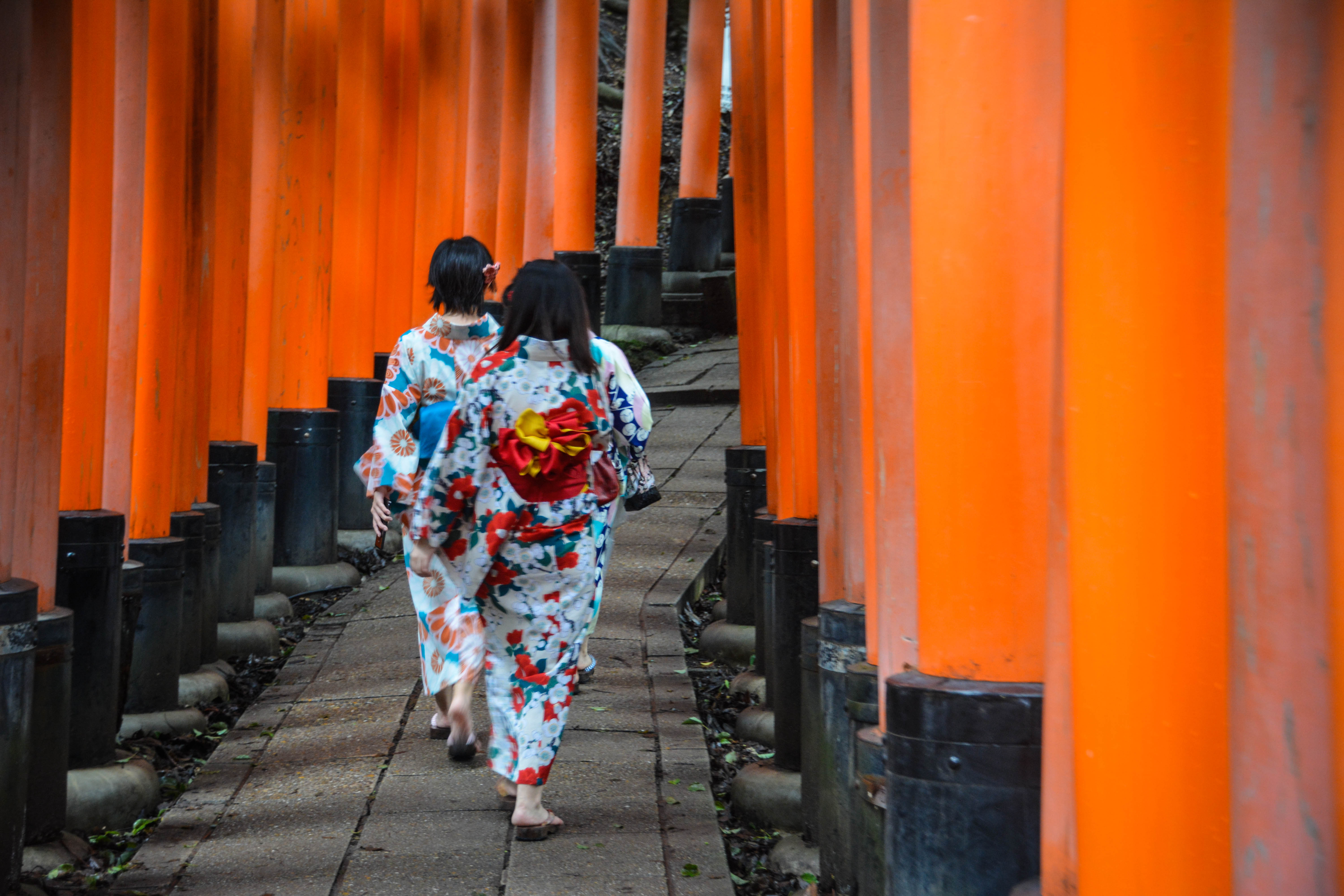Many Japanese wear Kimonos. The clothes, which have a similar status as traditional costumes in Germany, can be borrowed in many places in all cities, optionally also with photographer. Also in the corridors of the Tori gates, which represent a popular photo motive, we see again some kimono wearers.