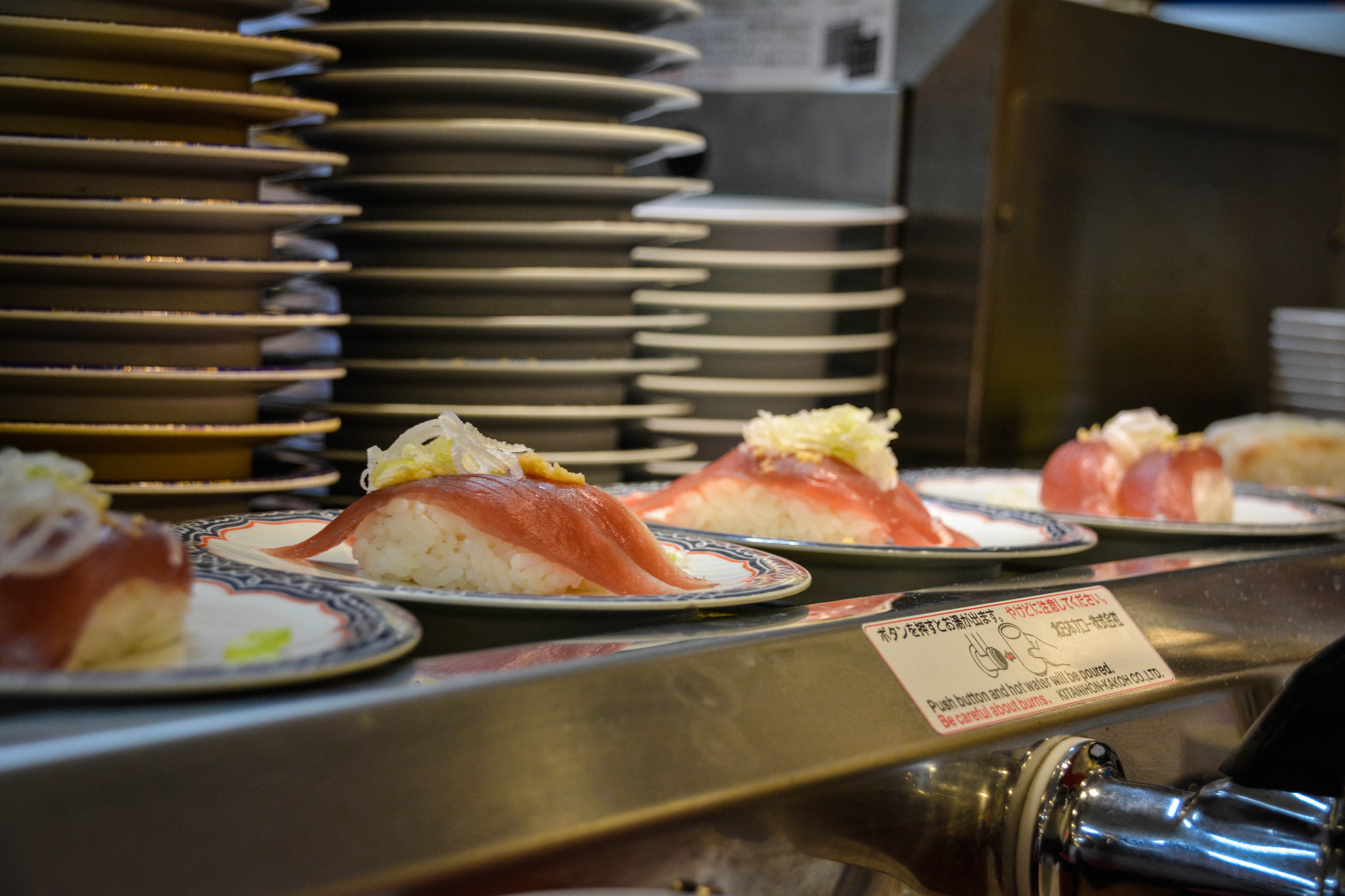There are expensive shops lined up at luxury boutiques and these in turn at high-class restaurants. Nevertheless, if one distances oneself some crossroads from the main road, one can find a big fish market. There are sushi shops, crab shops and other shops offering maritime products. Now we couldn’t hold back any longer and finally had to eat Sushi in Japan! Therefore we chose one of the many Suhsil shops with conveyor belt, where the small rice balls pass the seat and you can easily help yourself. The colour of the plates indicates the price and at the end the money is collected. When entering the shop we are greeted so joyfully by the cooks that in any case also the last one noticed that we arrived. As expected, the sushi is great!