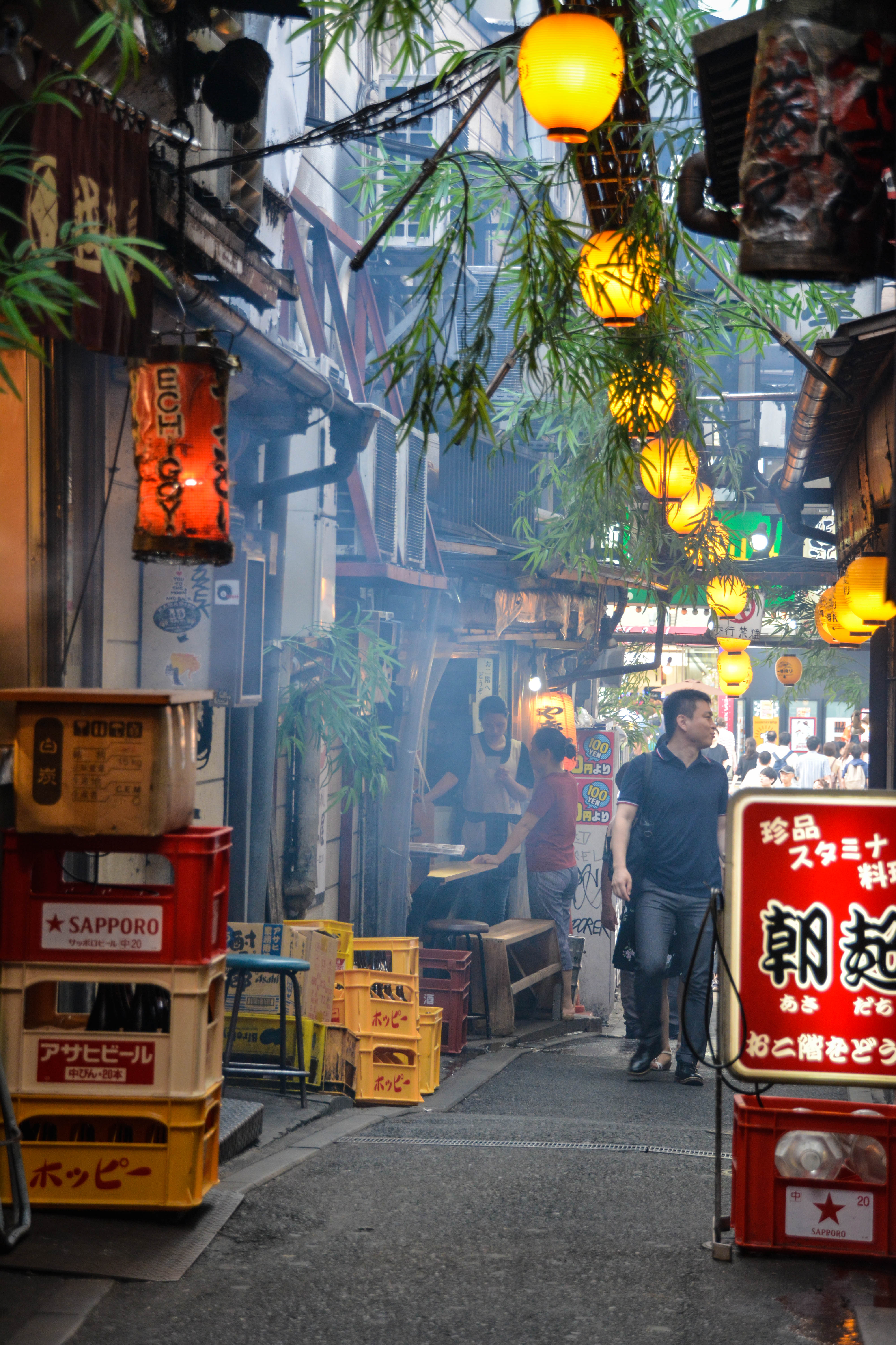 But when we arrived there it was very relaxed at first – there are many small areas in Shinjuku that differ a lot. Directly at the station there is a jumble of narrow alleys where you can eat Yakitori (meat skewers) or ramen. Walking through the alleys we alternated between good smells and smoke.